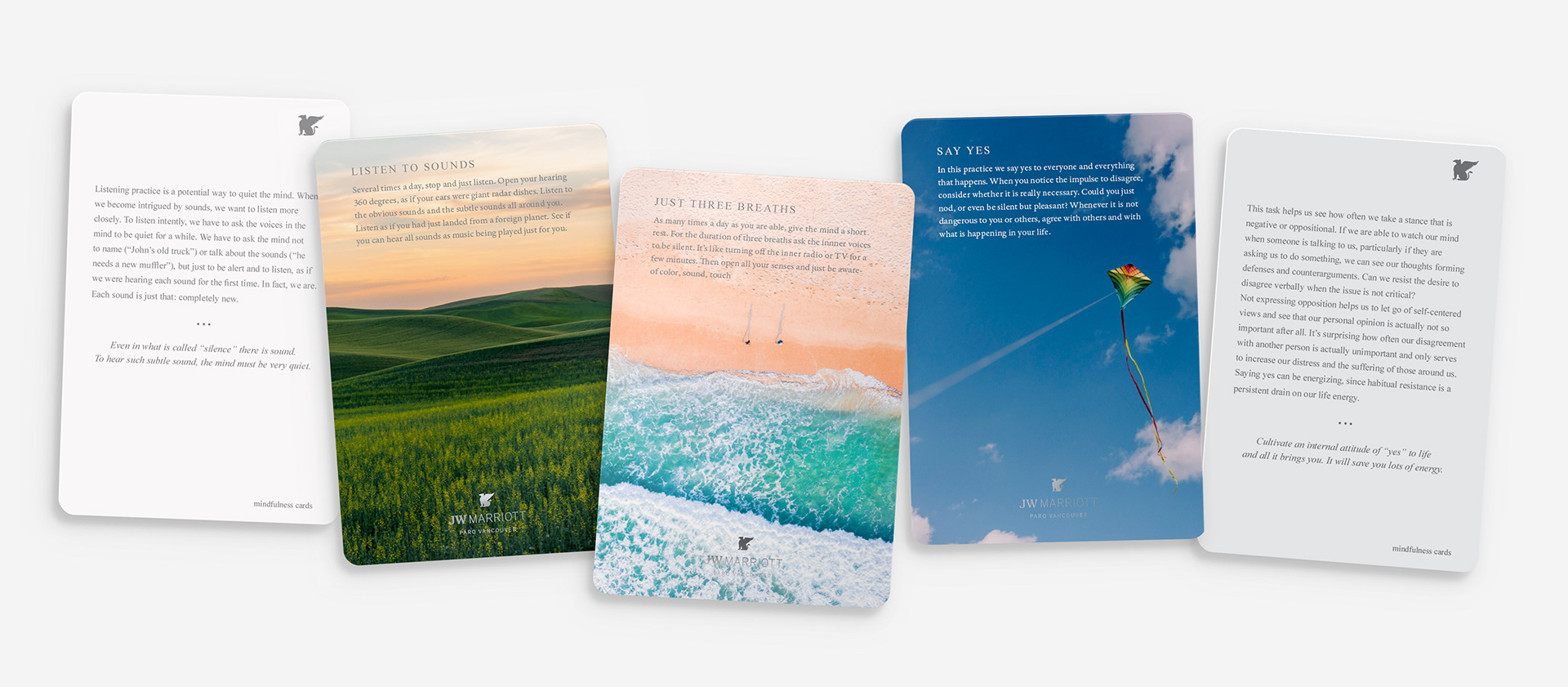 JW Marriott orders a wide variety of their materials, and they occasionally require design assistance for some specific needs. One project I developed in 2022 were these "mindfulness cards". They supplied the text and requested assistance with photo selections, and overall layouting. The final cards are printed in matte cardstock, with soft touch lamination and silver foil for the logo and text elements in the picture side of the cards.