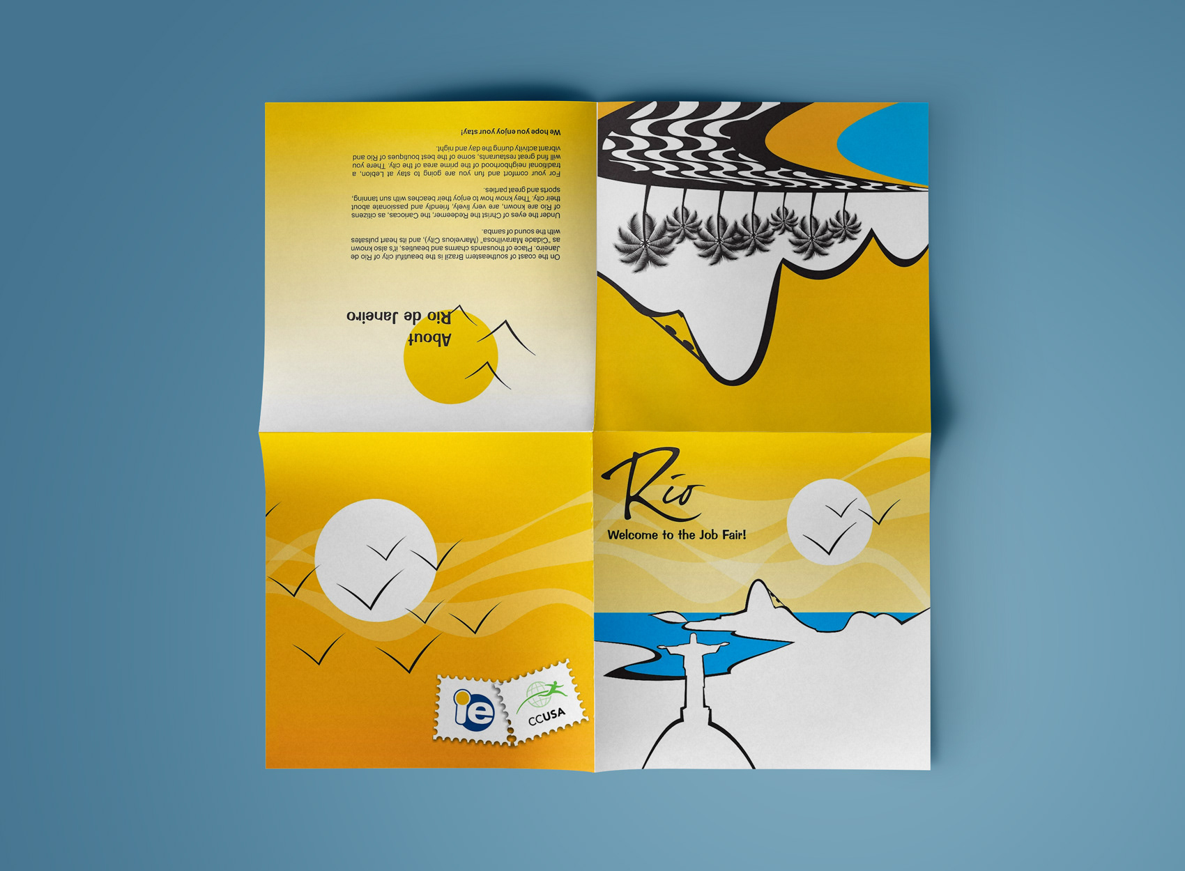 The layout was clean and elegant, with a professional and corporate feel, adopting simple shapes and fonts (Helvetica in different weights). The logo was the Statue of Liberty outlined by dots, representing the opportunities the program provided. The predominant color of the program's branding is scarlet red, to clearly distinguish it from the Work Experience USA's leaf green branding, and for being one of the colors of the American flag. The prices page was an insert due to fluctuating exchange rate and changes in payment conditions.