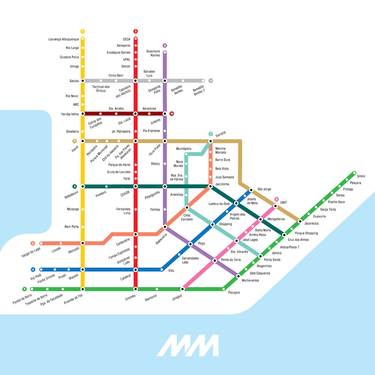 Maceió is my hometown, in the Northeast of Brazil. It grew fast, going from around 400 thousand inhabitants in 1980 to over 1 million in 2015. The bus system can't assist everyone and the number of cars have increased affecting traffic badly. Every time I go back home to visit my family it seems worse. I developed an initial concept for a subway system with 12 lines that would cross the whole city providing another transportation option. Once it is a very touristy destination, it would greatly benefit from a fast and reliable public transportation system.